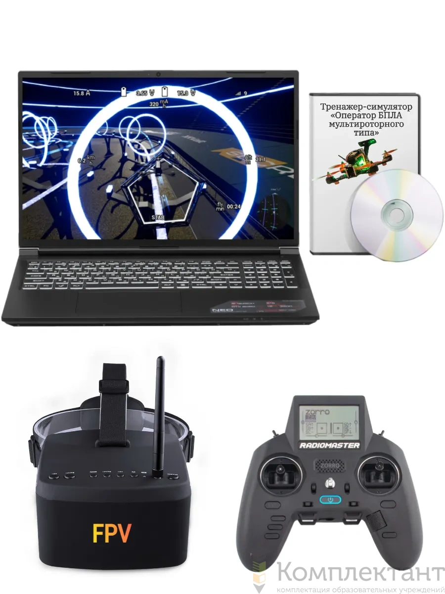 Программно-аппаратный комплекс, включающий ноутбук, FPV-шлем и пульт управления. Позволяет обучающимся тренироваться в виртуальной среде без риска повреждения оборудования.