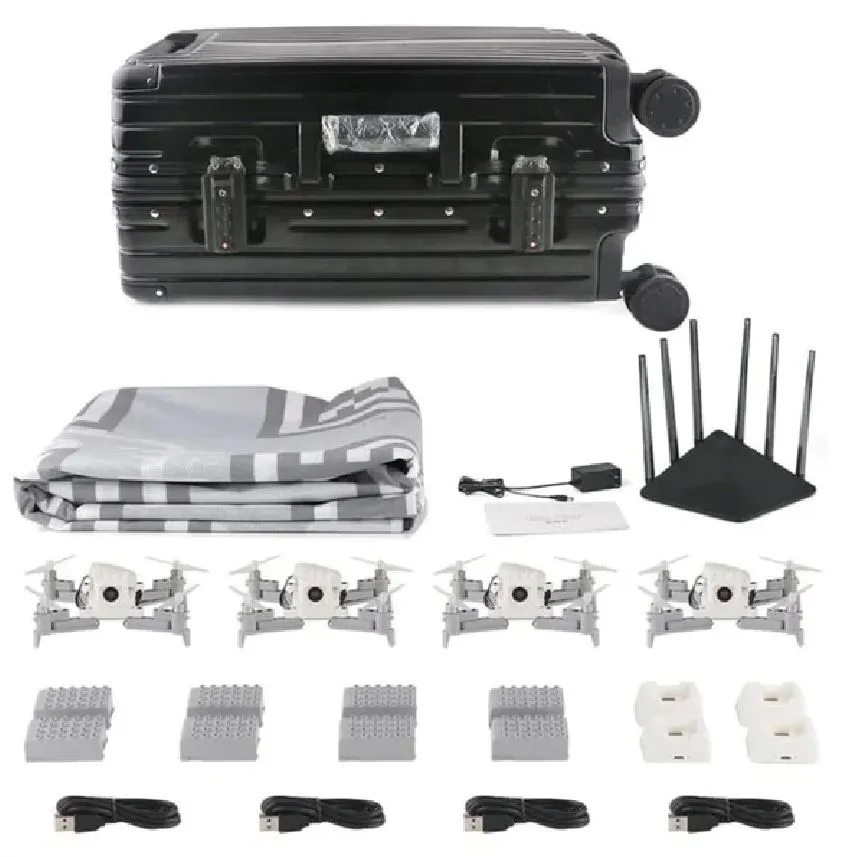 Образовательный комплект рой дронов Пчела. Комплект на класс 4 дрона хорошо подойдет для обучения программированию на Python в школах. В данный набор входят сразу 4 квадрокоптера с внушительным списком дополнительных компонентов, включающим запасные аккумуляторы/моторы/пропеллеры, а также модули позиционирования, светодиодные фонари, коврик, маршрутизатор.