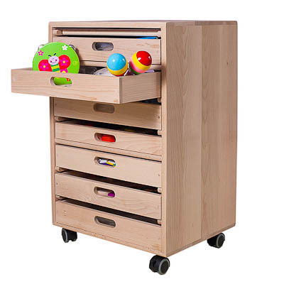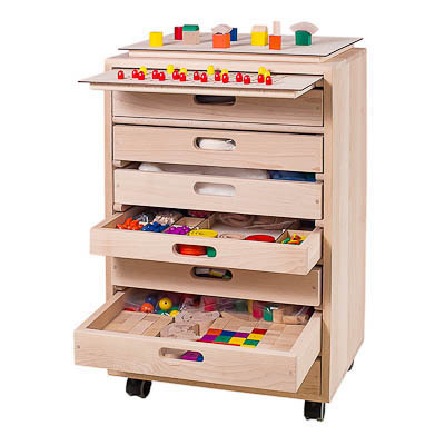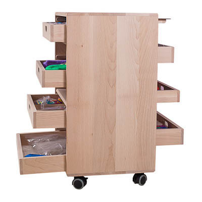 Мобильный стеллаж для хранения модулей изготовлен из натурального дерева (бука) и сконструирован в соответствии с педагогико-эргономическими требованиями, обеспечивает быстрый доступ к дидактическому материалу, простоту обзора и подбора необходимого для занятий материала.