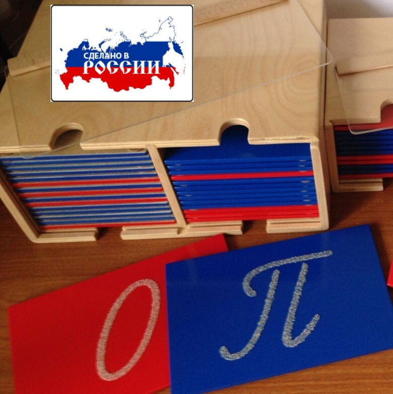 Эргономичные дощечки удобно хранить в прочных ящиках, а прозрачные крышки предоставляют прекрасный обзор и доступ к материалу. Возможность использовать к программе Монтессори позволяет применять набор в дошкольном возрасте, в коррекционной практике и в дополнительном образовании. Игры с изображением букв на тактильных досках знакомят детей с прописными заглавными и строчными буквами русского алфавита, готовят руку ребенка к письму, помогают в коррекционной работе со школьниками. Таблички окрашены в красный (гласные), синий (согласные) и белый ("ь" и "ъ") цвета и уложены в 2 деревянных ящика (в зависимости от размера). В комплекте 63 дощечки.