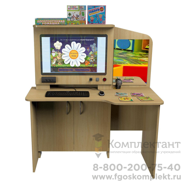 Конструкция логопедического стола исполнена в стиле классического компьютерного стола с комбинированным рабочим местом. Она объединяет в едином корпусе:
