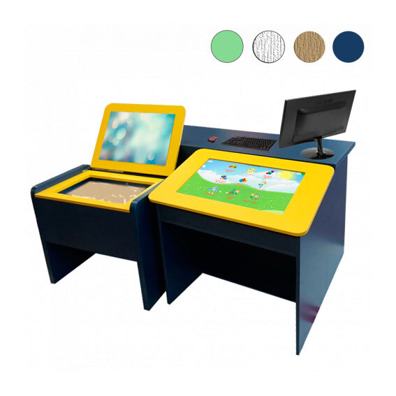 Рабочее место ребенка: Рабочее место педагога: Рабочее место психолога-педагога: Программное обеспечение: Возможности комплекса: Корпус изготовлен из ламинированной ДСП. Любая комбинация цветов на ваш выбор при заказе!Профессиональный модульный стол для кабинета детского психолога-дефектолога