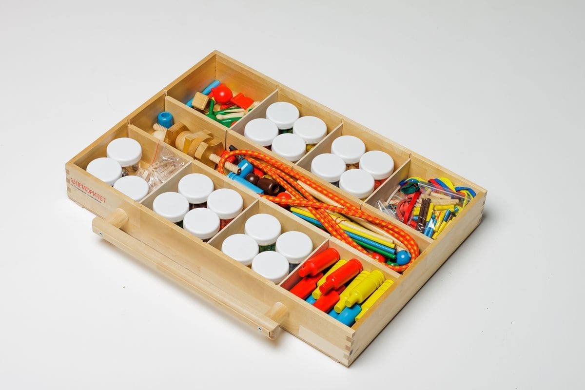 Входящие в состав модуля детали предназнвчены для создания различных комбинаций. Игровые элементы изготовлены из дерева, при этом самые мелкие из них хранятся в специальных закрывающихся крышками контейнерах.