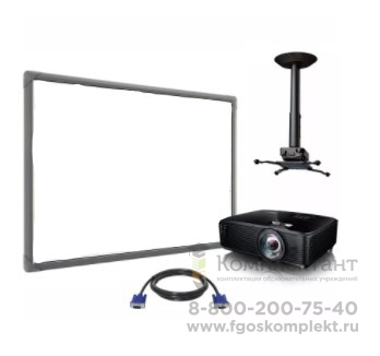 Интерактивная доска, настенное крепление для доски, видеопроектор SVGA, 4000 Лм, потолочное крепление для проектора, видеокабель SVGA 15м, usb кабель, длина 5 м, безбатарейный стилус, 2 шт, телескопическая указка
