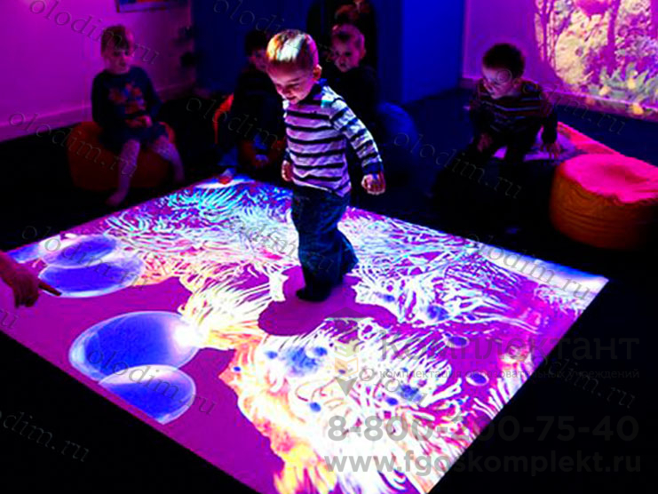 С ним обычный проход по коридору станет для детей увлекательным приключением: он может быть поверхностью океана, в которой плавают рыбки; огромным футбольным полем, на котором можно поиграть с мячом; летним лугом с цветами и бабочками и д.р. – при этом изображение будет моментально реагировать на движение детей.