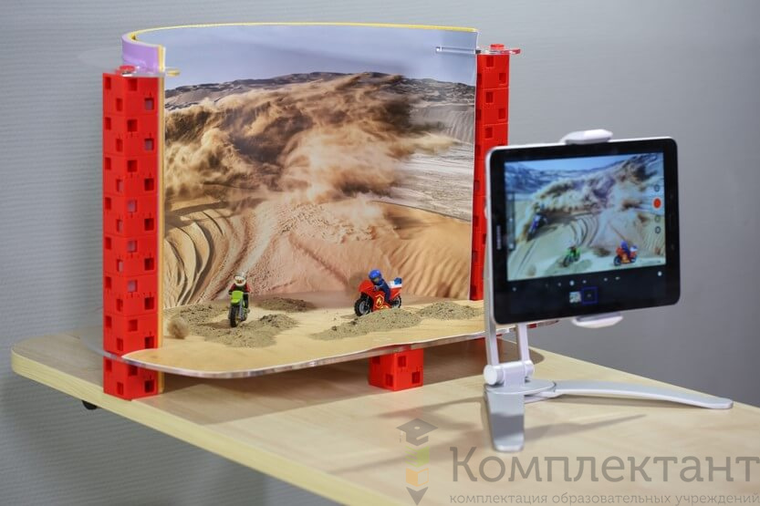 Особенностью мультлаборатории является возможность трансформировать съемочную площадку под творческие задачи оператора. Это достигается использованием в качестве строительного материала пластиковых кубиков со специальным креплением, входящих во множество наборов, выпускаемых нашей компанией. Данное решение допускает широкое применение элементов набора Академия Наураши «Курс логики базовый» (30 элементов) или набора Академия Наураши «Курс логики базовый» (60 элементов) для создания подвижных платформ. Такие технологии существенно расширяют возможности реализации эффектов движения в кадре.