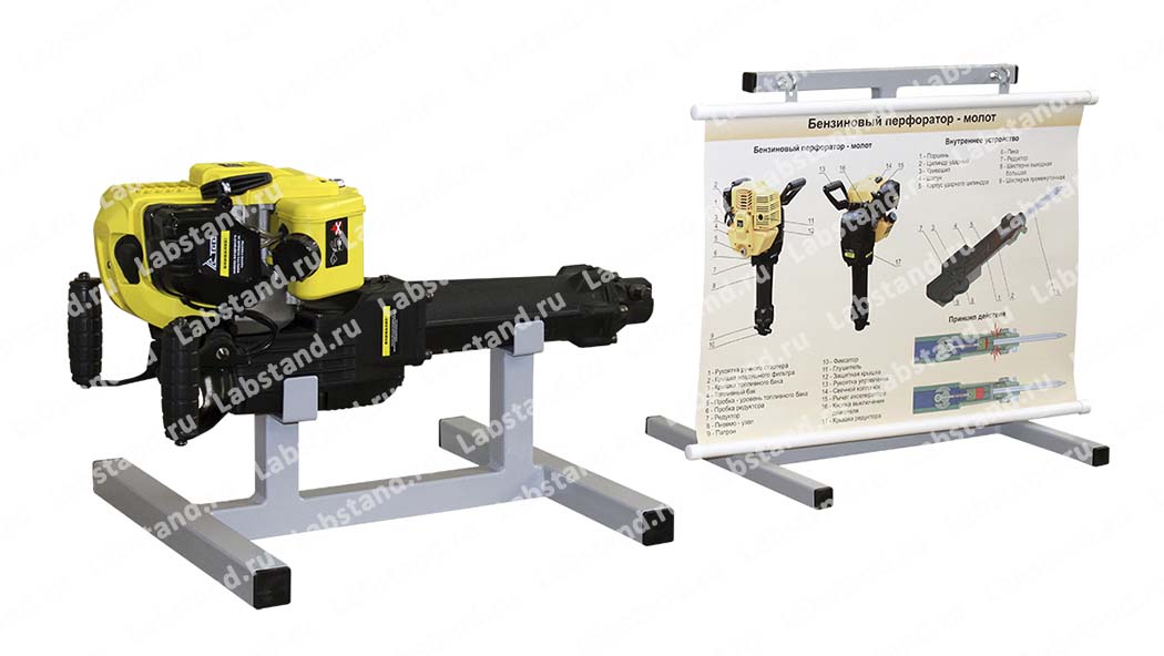Описание: Стенд-тренажер представляет собой бензиновый перфоратор-молот, подготовленный для разборки и сборки, на металлическом основании с цветным плакатом формата А2, иллюстрирующем устройство и принцип действия бензинового перфоратора-молота.