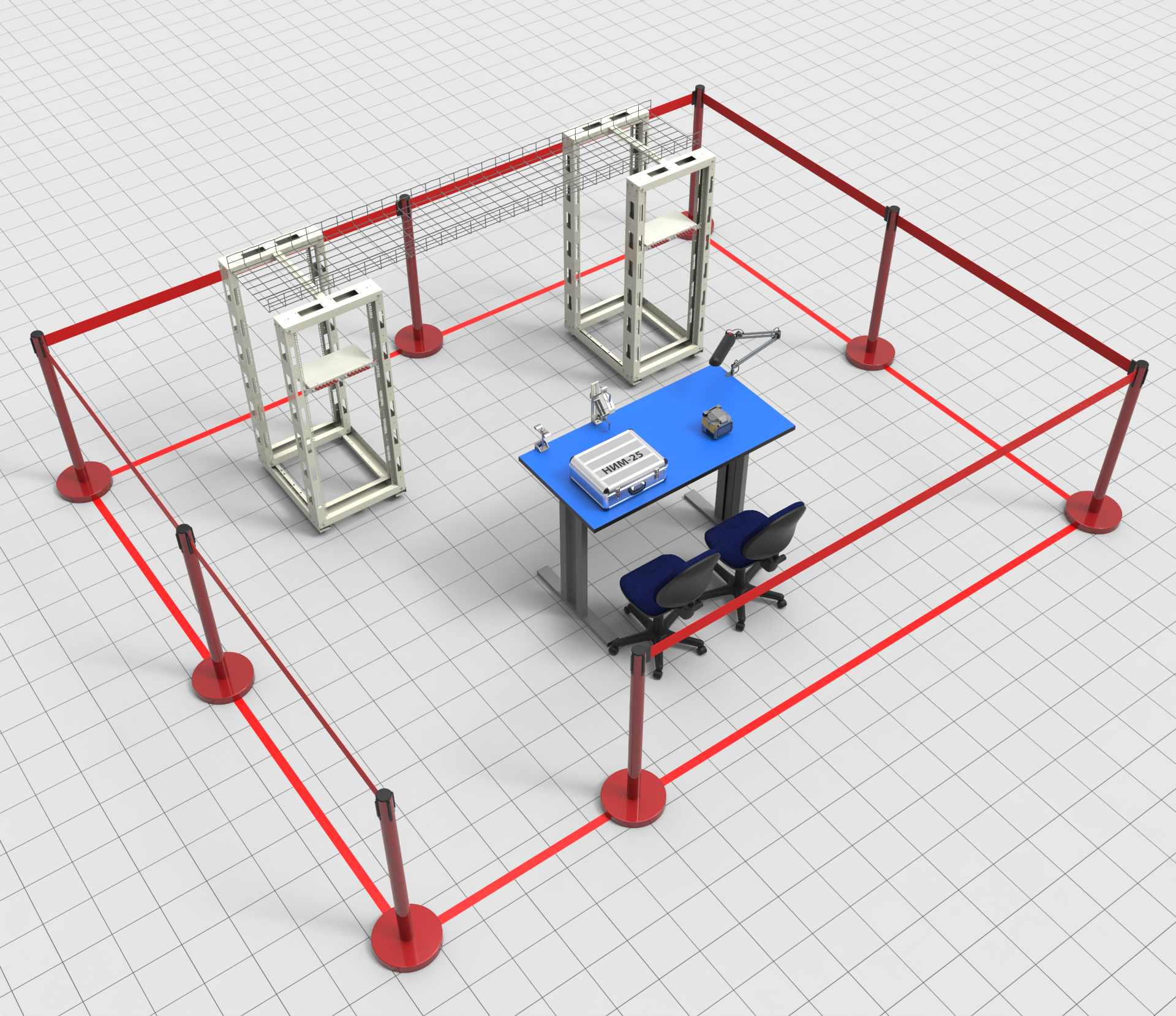 Стенд представляет собой огороженную рабочую площадку, которая включает в себя две двух рамных телекоммуникационных стойки от 24 до 42 U, макет инженерных конструкций со смонтированным кабельным лотком. Стол рабочий (верстак) монтажника оптоволоконных сетей с набором необходимого инструмента, с дополнительным регулируемым освещением, а также устройством крепления кабеля и двух креплений для муфт.