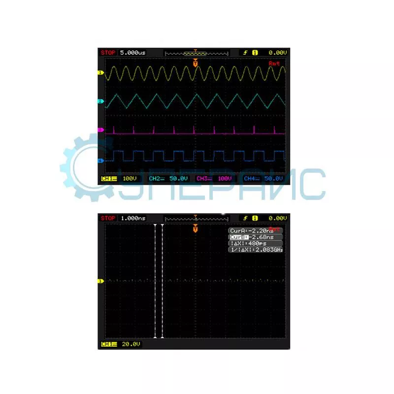 Автоматическое измерение | размах сигнала, амплитуда, максимальное значение, минимальное значение, уровень вершины, уровень опоры, среднее значение, среднеквадратичное значение, выброс перед фронтом, выброс после фронта, период, частота, длительность положительного импульса, длительность отрицательного импульса, время нарастания, время спада, коэффициент заполнения для положительного импульса, коэффициент заполнения для отрицательного импульса, задержка, сдвиг фаз |