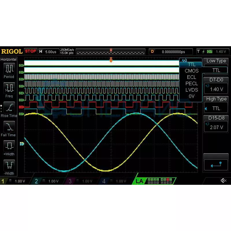 Автоматическое измерение | Пиковое значение, Верхнее значение, Нижнее значение, Амплитуда, Среднее, Среднеквадратичный корень, Превышение, Предварительная съемка, Площадь, Площадь периода, Частота, Период, Время нарастания, Время спада, Ширина положительного импульса, Ширина отрицательного импульса, Цикл положительного коэффициента, Отрицательный коэффициент заполнения Цикл, Задержка A → B ↑, Задержка A → B ↓, Фаза A → B ↑, Фаза A → B ↓ |