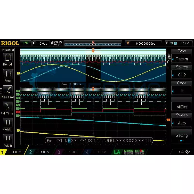 Режимы триггера | фронт, импульс, видео (NTSC,PAL,SECAM), Slope, рант, окно, шаблон, N фронт, истечение времени, длительность события, установка/удержание, RS232/UART, I2C, SPI |