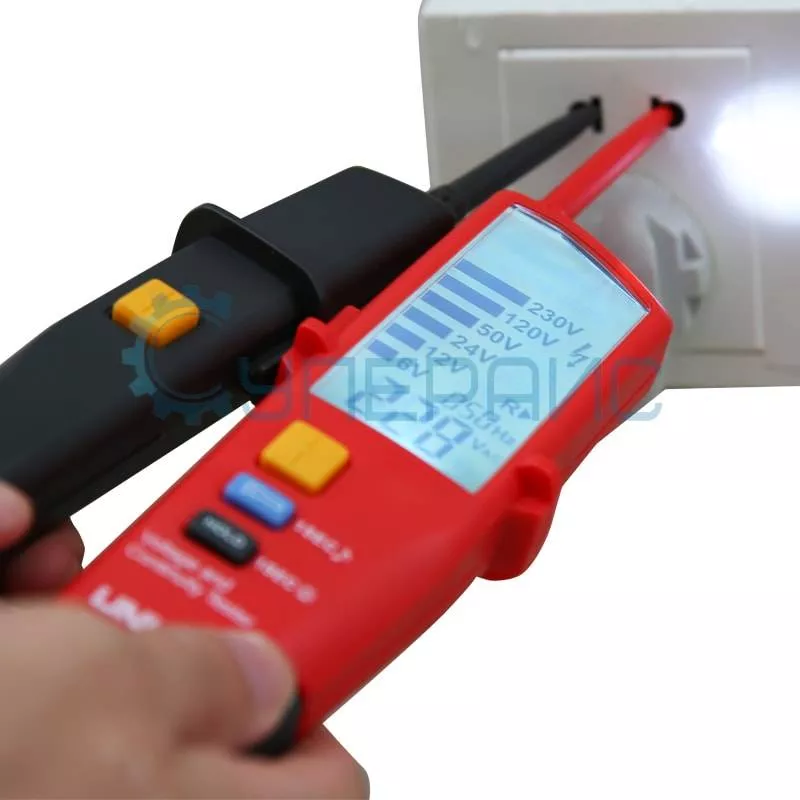 UNI-T UT18D — высококачественный тестер напряжения промышленного класса, оснащенный функцией измерения напряжения, частоты, последовательности фаз для трехфазной системы переменного тока, тестирования автоматов УЗО, самопроверки, прозвонки цепи, тестирования напряжения одним щупом. Прибор работает как с постоянным, так и с переменным напряжением. Результаты измерений выводятся на ЖК-дисплей с подсветкой, что позволяет производить измерения при плохом освещении или в темное время суток. Для включения подсветки на ЖК индикаторе следует нажать и удерживать в течение 1 секунды кнопку HOLD. Для удобства считывания результаты замеров (напряжение и частота) можно задержать, кратко нажав кнопку HOLD на приборе после измерения. В процессе работы, тестер напряжения UT18D автоматически определяет и подбирает необходимые настройки: вы можете сразу приступать к измерению без всяких включений и переключений. Прибор имеет возможность работы с трехфазными цепями и позволяет производить простые измерения в случае севшей батареи или ее отсутствия. Индикатор напряжения удобно лежит в руке, прост в применении, допускает работу в перчатках и обеспечивает быструю и надежную фиксацию щупов.