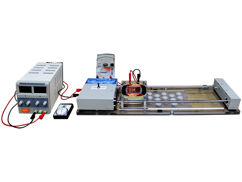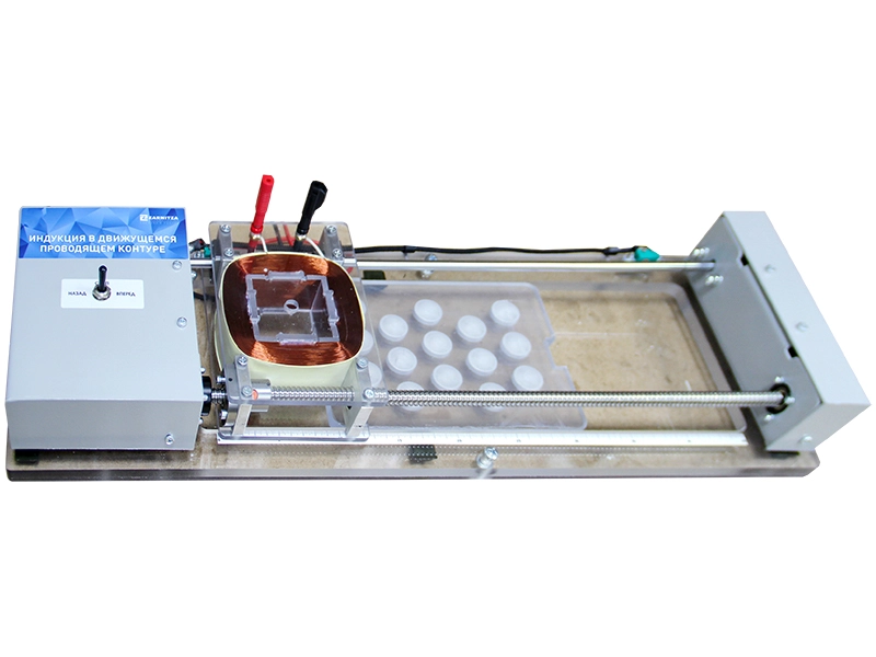 Лабораторная установка "Индукция в движущемся проводящем контуре" представляет собой основание, на поверхности которого размещены: блок электропривода с органами управления движением подвижной катушки, ложемент с магнитами, проводящая катушка на подвижной каретке. Для измерения напряжения, наведенного в катушке, установка комплектуется мультиметром.
