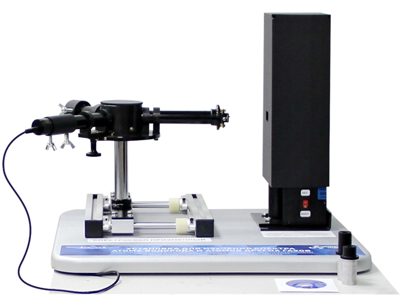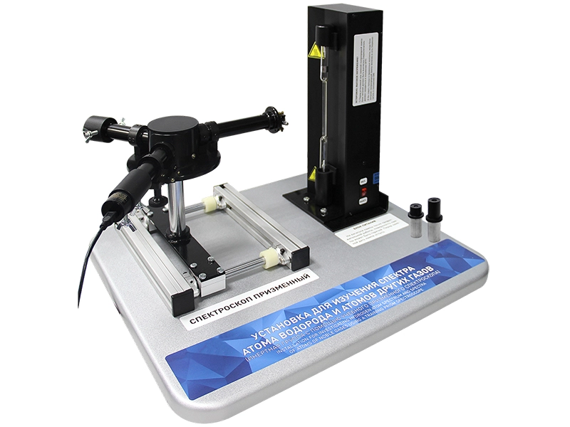 Лабораторный стенд "Изучение спектра атома водорода" выполнен в настольном исполнении. Установка включает в себя спектрометр на подвижной раме, спектральную трубку с водородом, видеокамеру, осветитель шкалы.