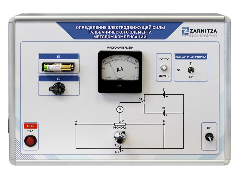 Лабораторный стенд "Определение электродвижущей силы гальванического элемента методом компенсации" предназначен для измерения электродвижущей силы гальванического элемента методом компенсации и количественной оценки точности результатов измерений.