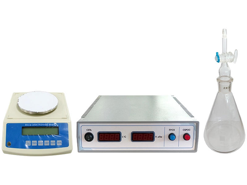 Конструктивно лабораторный стенд представляет собой измерительный модуль, лабораторные весы и колбу с отводом и краном. К отводу стеклянной колбы присоединяется трубка для откачки воздуха. Измерительный модуль предназначен для определения изменения давления в емкости и должен быть снабжен вакуум-насосом для откачки воздуха из колбы, датчиком давления и электромагнитным клапаном.