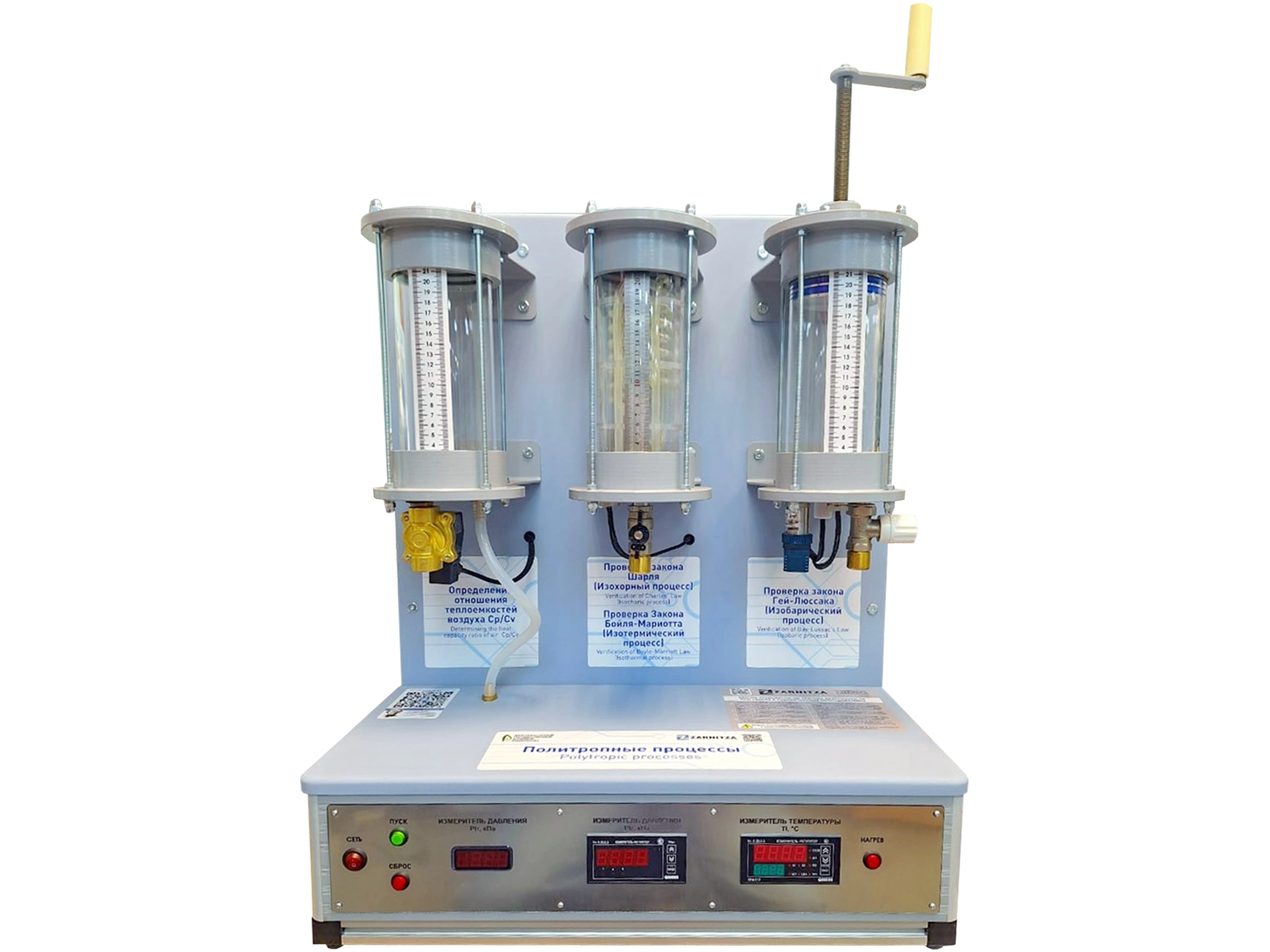 Комплект учебно-лабораторного оборудования "Политропные процессы" (далее – стенд) предназначен для проведения лабораторно-практических занятий по курсу "Молекулярная физика и термодинамика", позволяет изучать основные законы молекулярной физики.