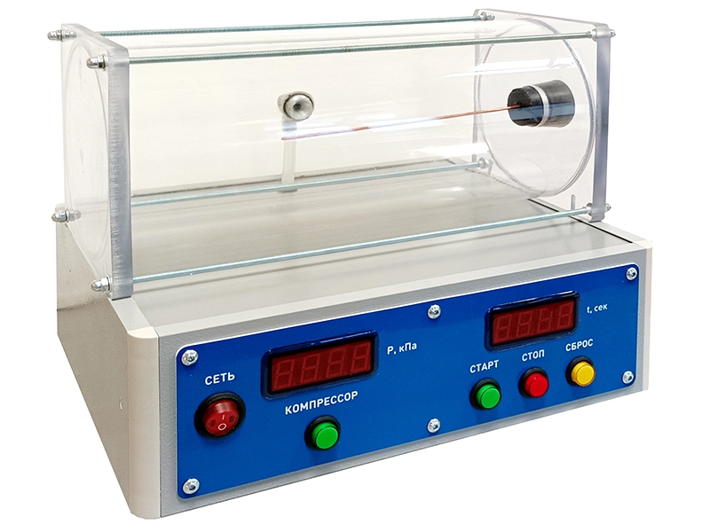 Конструктивно оборудование представляет собой измерительный модуль с установленной на нем цилиндрической емкостью. Цилиндрическая емкость сообщается с атмосферой через капиллярную трубку. Давление в колбе нагнетается компрессором, установленным в измерительном модуле, по пневматической трубке. Измерительный модуль предназначен для определения изменения давления в емкости в любой промежуток времени проведения эксперимента.