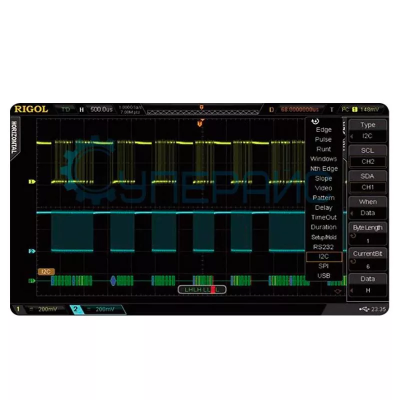 Режимы триггера | фронт, импульс, видео (NTSC,PAL,SECAM), рант, окно, шаблон, N фронт, истечение времени, скорость нарастания, длительность события, установка/удержание, RS232/UART, I2C, SPI, USB, CAN, LIN |