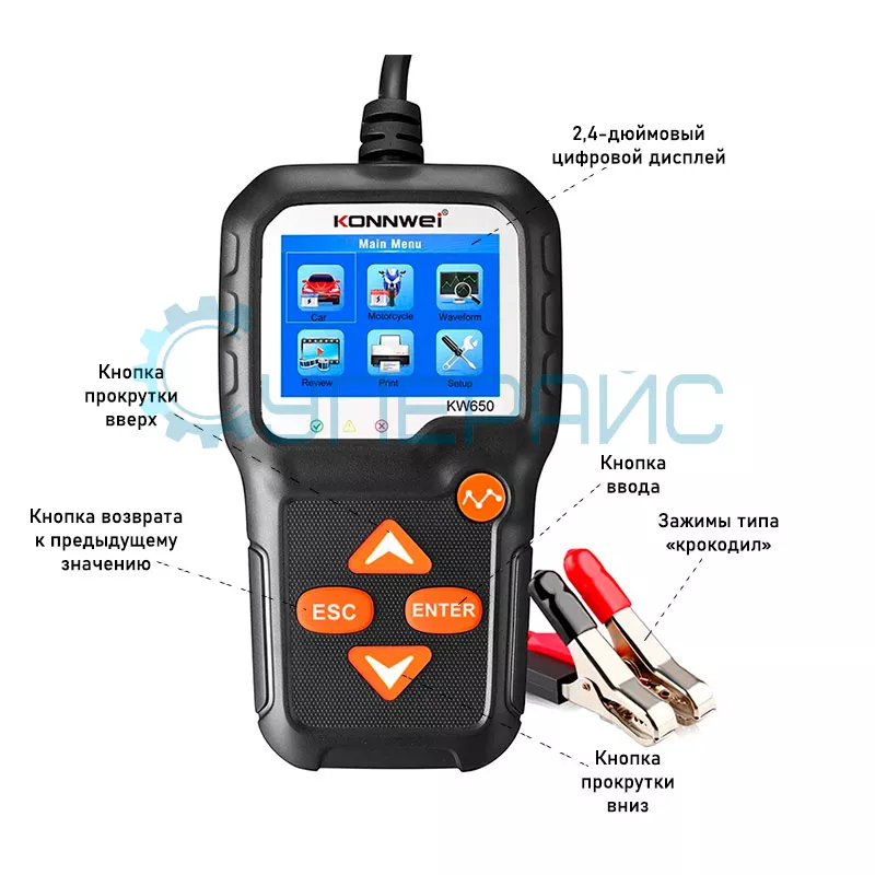 Данный тестер аккумуляторов совместим с батареями напряжением 6 и 12 Вольт. Способен отображать результаты тестирования как в текстовом, так и в графическом виде на 2,4-дюймовом дисплее. Само напряжение аккумулятора изображается в виде волны.