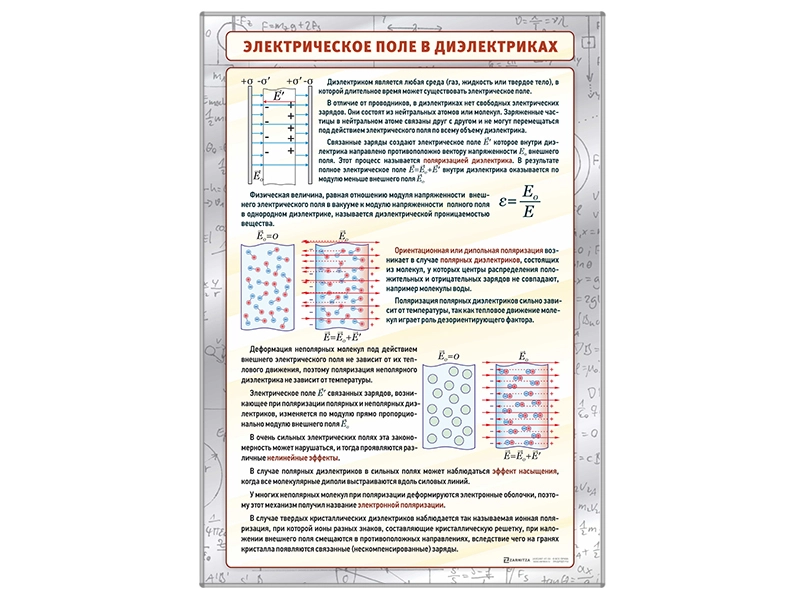 Стенд представляет собой информационную панель, на которой изображено описание основных понятий об электрическом поле в диэлектриках.