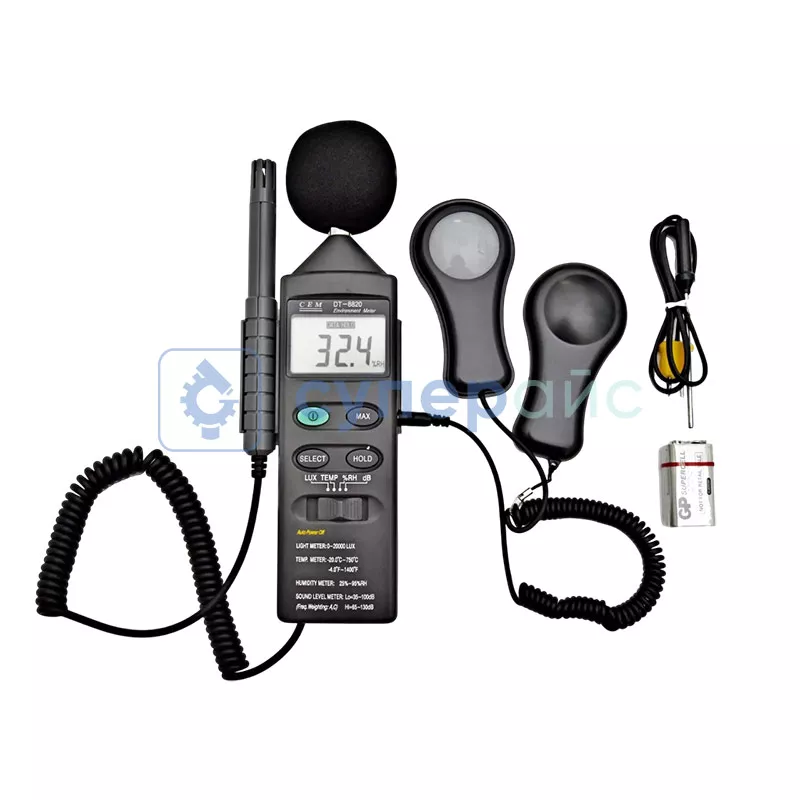 Комплектация | многофункциональны измеритель CEM DT-8820 – 1 шт батарея типа "Крона" – 1 шт термопара типа К – 1 шт датчик влажности – 1 шт датчик освещенности – 1 шт микрофон шумомера – 1 шт руководство пользователя – 1 шт |