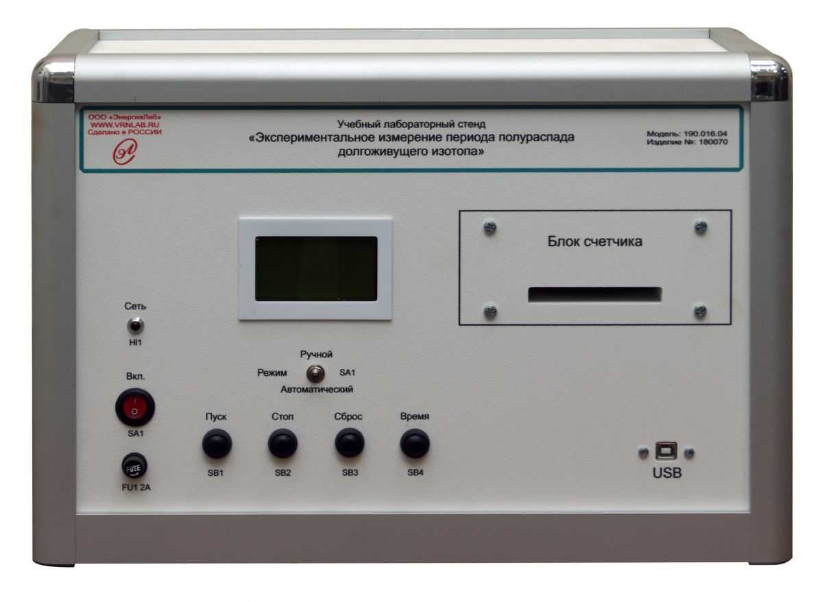 Учебная лабораторная установка «Измерение периода полураспада долгоживущего изотопа» позволяет воспроизвести серии измерений интенсивности излучения от радиоактивного источника 40К в соли KCl (количество актов радиоактивного распада), определить активность изотопа и вычислить период полураспада.
