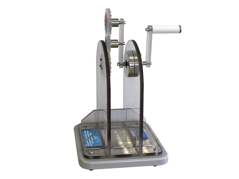 Лабораторный стенд представляет собой настольную конструкцию, приводимую в движение ручкой, при вращении которой происходит перемещение шестерен.
