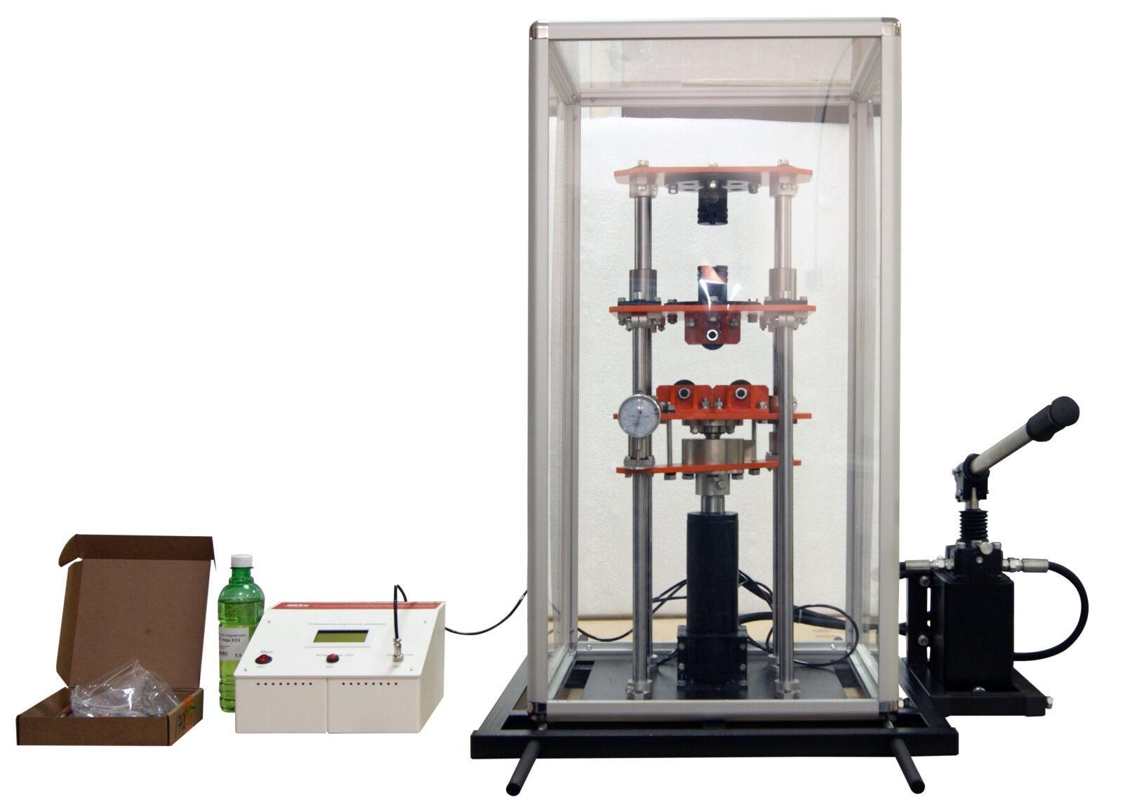 Экспериментальная часть состоит из силовой рамы с устройством механической нагрузки образцов гидравлическим домкратом с усилием не менее 30 кН, неподвижной траверсы с приспособлением для установки образцов, прецизионным микрометром часового типа с точностью измерения перемещения подвижной траверсы не хуже 0,1 мм, прозрачного защитного кожуха, а также экспериментальных образцов.