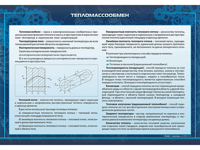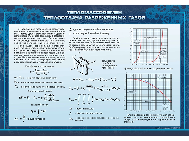 Комплект стендов «Тепломассобмен» представляет собой комплект информационных панелей, на которых размещены рисунки, схемы, таблицы, графики и формулы по курсу «Тепломассобмен».