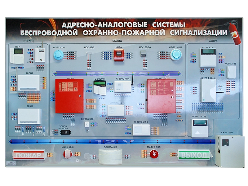Интерактивный демонстрационно-тренажерный стенд предназначен для изучения принципов построения охранно-пожарной и адресно-аналоговой пожарной сигнализации, работающей как автономно, так и с передачей тревожных извещений по различным каналам связи на пульт централизованного наблюдения.
