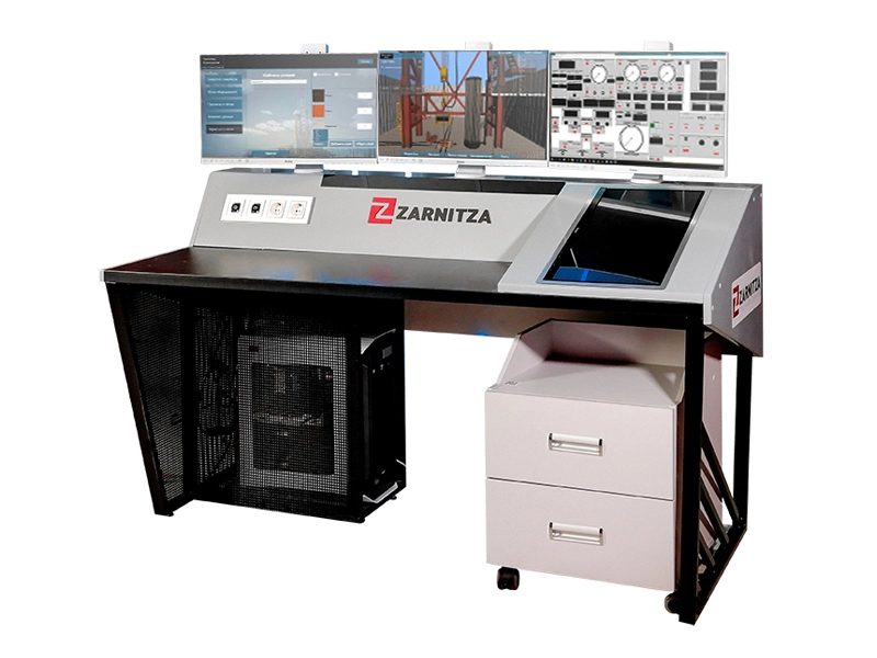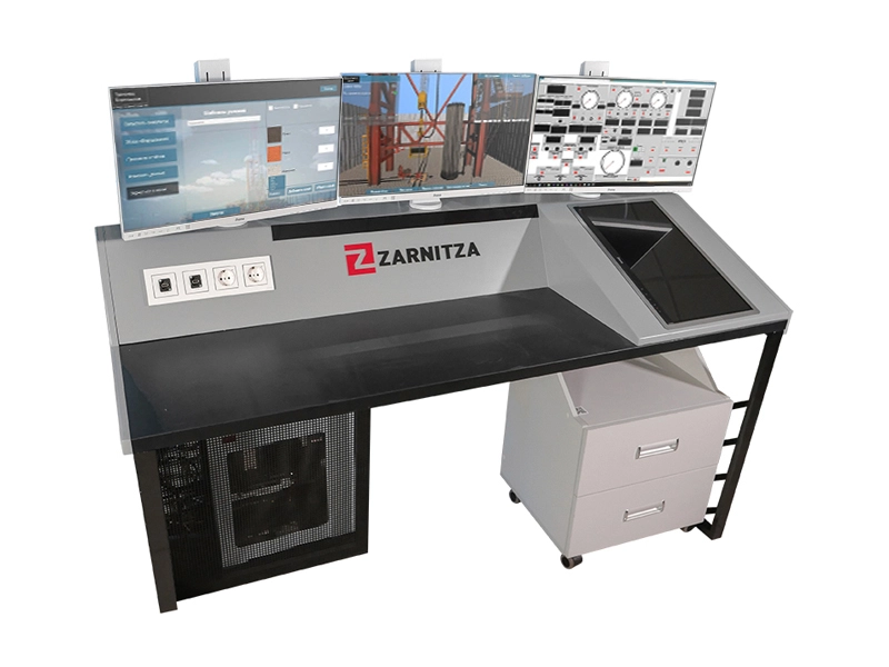 - Мультимедийный комплекс на базе ПК с 3 мониторами, со съемной сенсорной панелью, поверхностью для дополненной реальности, шлемом, манипуляторами виртуальной реальности, манипулятором рулем и педалями.