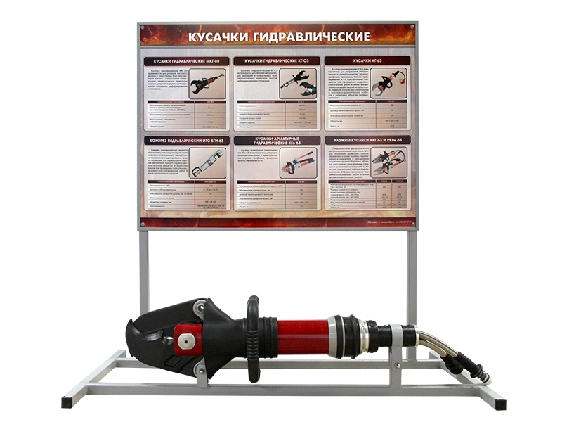 Демонстрационный стенд оснащен информационным панно, установленным на металлическом кронштейне, на котором представлена информация о существующих видах гидравлических кусачек.Комплектация