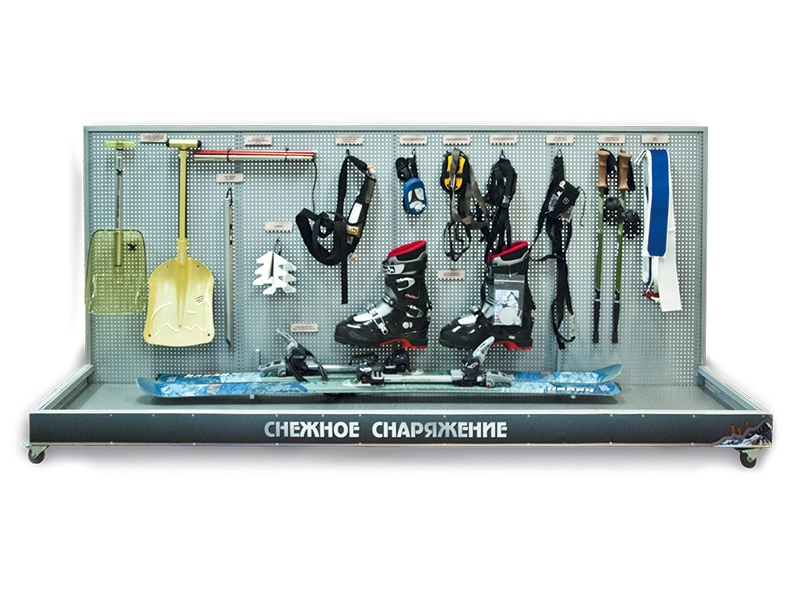 Демонстрационный стенд "Снежное снаряжение" представляет собой напольную конструкцию из двух вертикальных стоек, монитора из перфорированного листового метала и металлического основания - бокса.