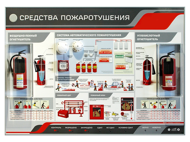 Стенд-тренажер представляет собой информационную панель, оснащенную натуральными макетами средств и оборудования, предназначенного для ликвидации возгорания.