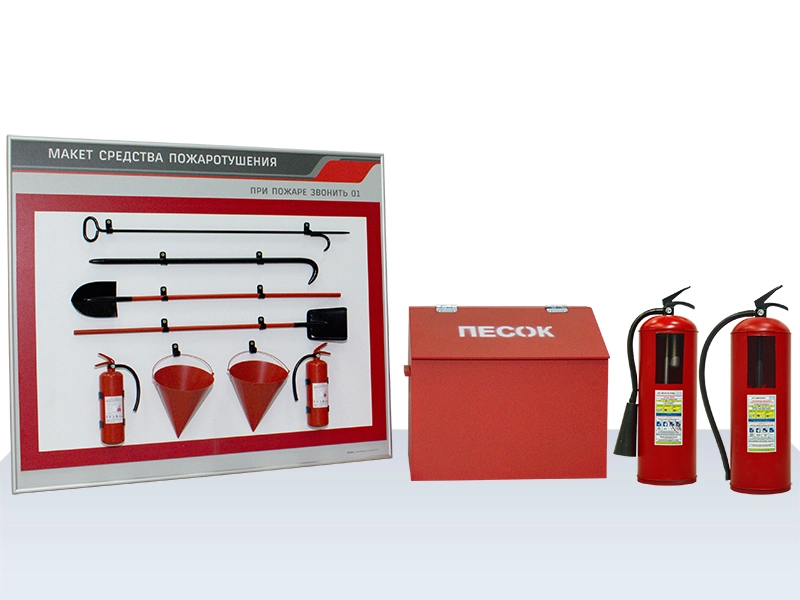 Макет "Средства пожаротушения" представляет собой масштабную визуализацию, на которой представлены: