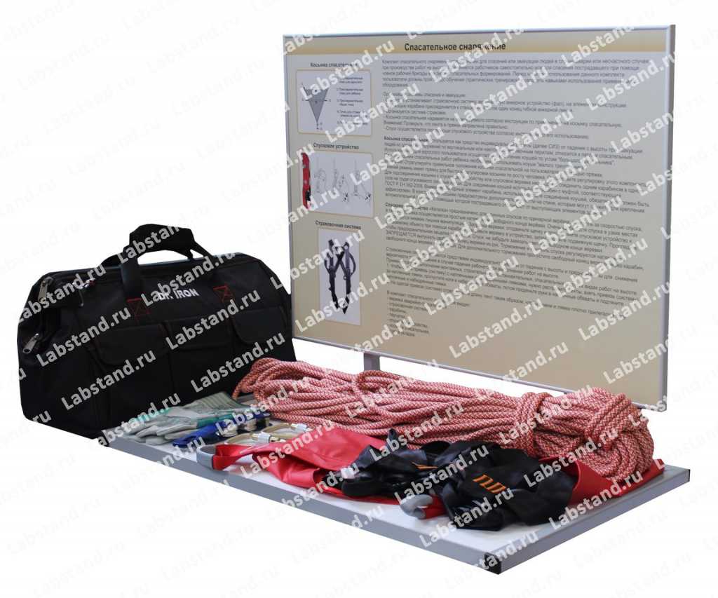 Назначение: Стенд-тренажер предназначен для проведения комплекса практических работ по изучению общего устройства и принципов работы спасательного снаряжения для эвакуации людей с высоты, а также формированию первоначальных навыков по использованию снаряжения.
