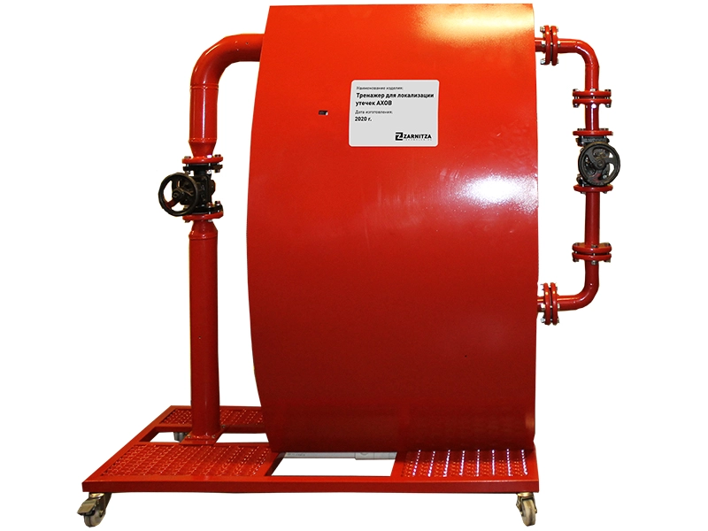 Тренажер позволяет проводить тренировки спасателей в максимально приближенных к реальной аварии условиях и обеспечивает отработку навыков работы с оборудованием, применяемым при локализации утечек аварийно химически опасных веществ (АХОВ). В состав тренажера входит имитатор емкости, выполненный в виде участка ее цилиндрической поверхности с системой трубопроводов, фланцевых соединений и запорной арматурой, установленных на платформу.