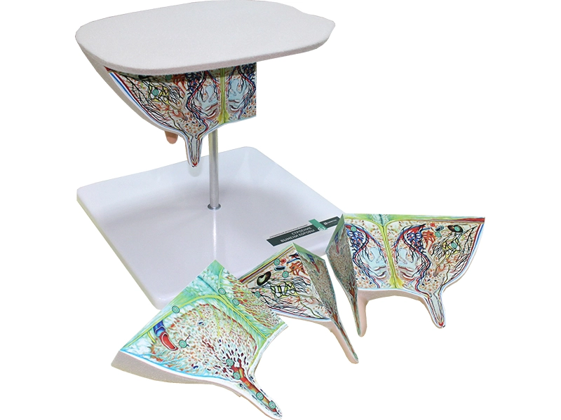 Данный макет представляет собой полноцветную, детализированную модель коровьего вымени. Он показывает внутреннюю и внешнюю анатомию вымени коровы и представляет собой установленную на подставке полноцветную детализированную модель молочной железы коровы, на которой отражены такие анатомические детали, как артерии, вены, лимфатические сосуды, а также молочные проходы и четыре железистые области. Макет вымени съемный в масштабе 1:1 и делится 4 части.
