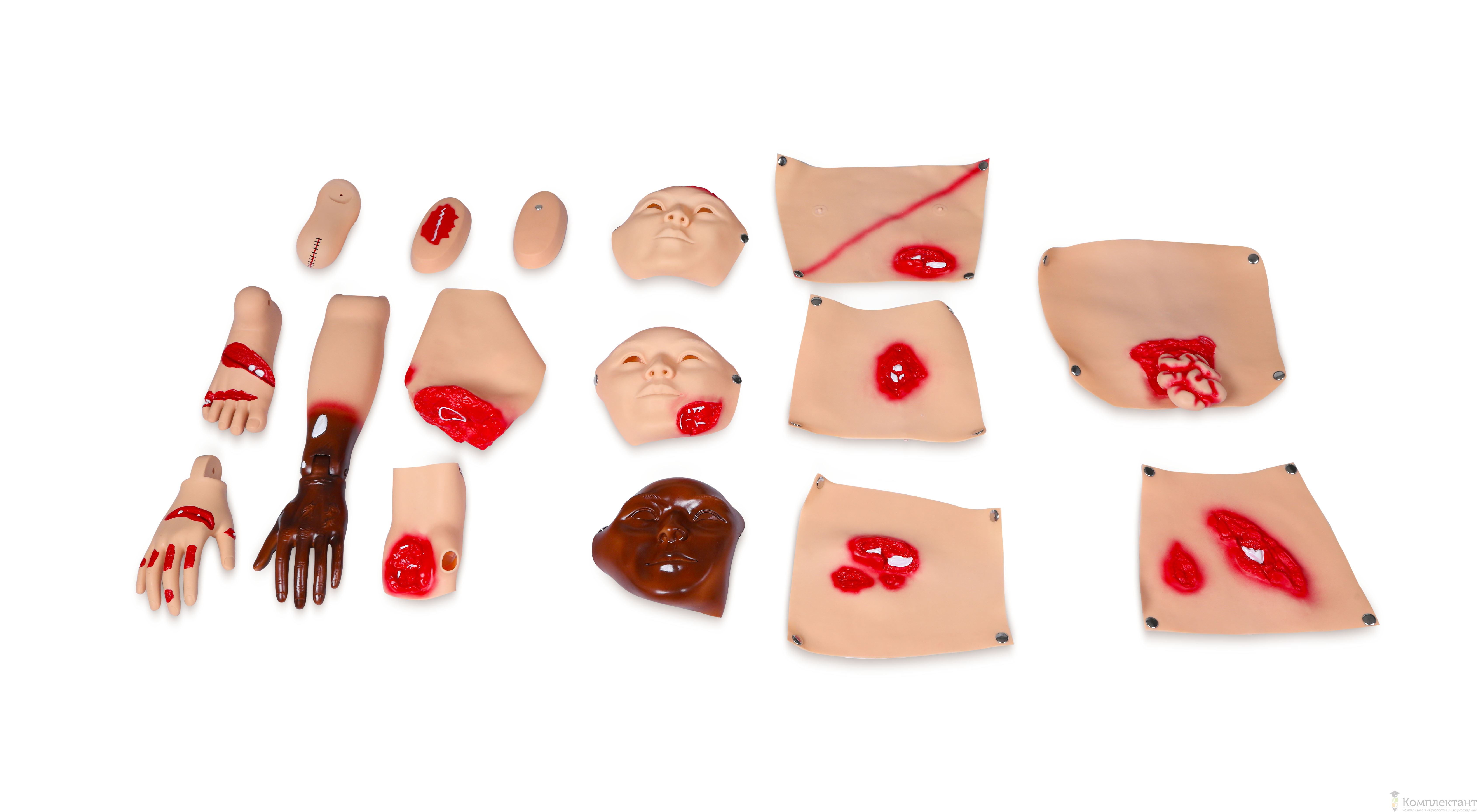 Тренажер укомплектован набором ранений и поражений из 11 предметов для отработки навыков первой помощи и ухода при различных травмах . В состав набоа водят имитаторы следующих травм: