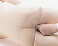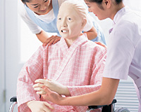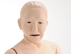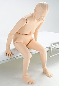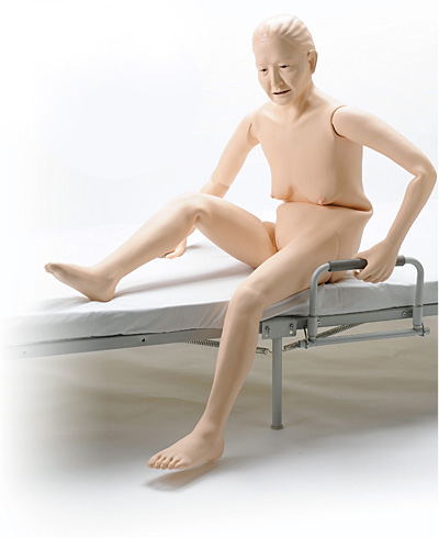 Пожилой пациент был создан для того, чтобы мед персонал мог прочувствовать насколько не просто ухаживать за престарелыми людьми, с какой нежностью и заботой нужно к ним относиться. Структура кожи, подвижность суставов, выражение лица, фигура-все напоминает о живом человеке, ощущение ухода за живым человеком. У манекена подвижна нижняя часть туловища, чтобы была возможность наклонять его вперед, сажать в кресло-каталку. Движения ног и тазобедренных суставов плавные, их можно сгибать так, как удобно мед персоналу. Поверхность манекена достаточно реалистична, состоит из силикона, что позволяет купать и мыть моющими средствами пациента. Суставы так же сделаны из прочного материала. Голова вращается в разные стороны(вправо, влево, вверх, вниз).Кроме этого можно вставлять и изымать вставные челюсти, а так же ухаживать за ротовой полостью.Суставы в плечах, локтях, запястьях, бедрах, коленях и лодыжках двигаются достаточно сухо, как у пожилого человека, но это все же дает возможность менять белье пациента. Ноги пациента достаточно гибкие, что позволяет усаживать его на утку, либо укладывать его так, чтобы можно было извлекать экскременты из ануса. Все тело подвижно, что позволяет поворачивать пациента на кушетке воизбежания пролежней.