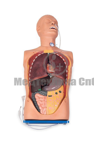 Прозрачная лицевая стенка торса и обзорное окошко в модуле головы позволяют изучать анатомическое строение человека и наблюдать за проведением манипуляций. Модули зрачков с реакцией на свет и имитация пульса на сонной артерии позволяют симулировать признаки жизнедеятельности.