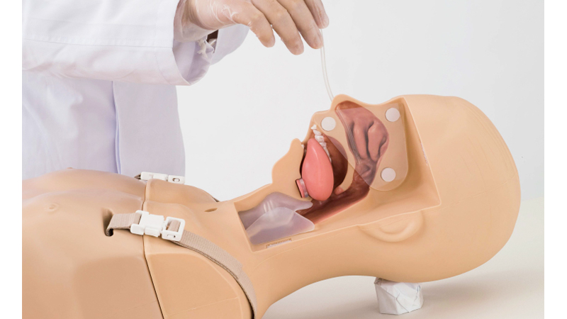 Тренажер позволяет отрабатывать навыки введения аспирационных катетеров в носовую полость, ротовую полость и трахеостому, а также выполнять процедуры аспирации, кормления через назогастральный зонд и ухода за гастростомой, которые обычно применяются в уходе за больными.