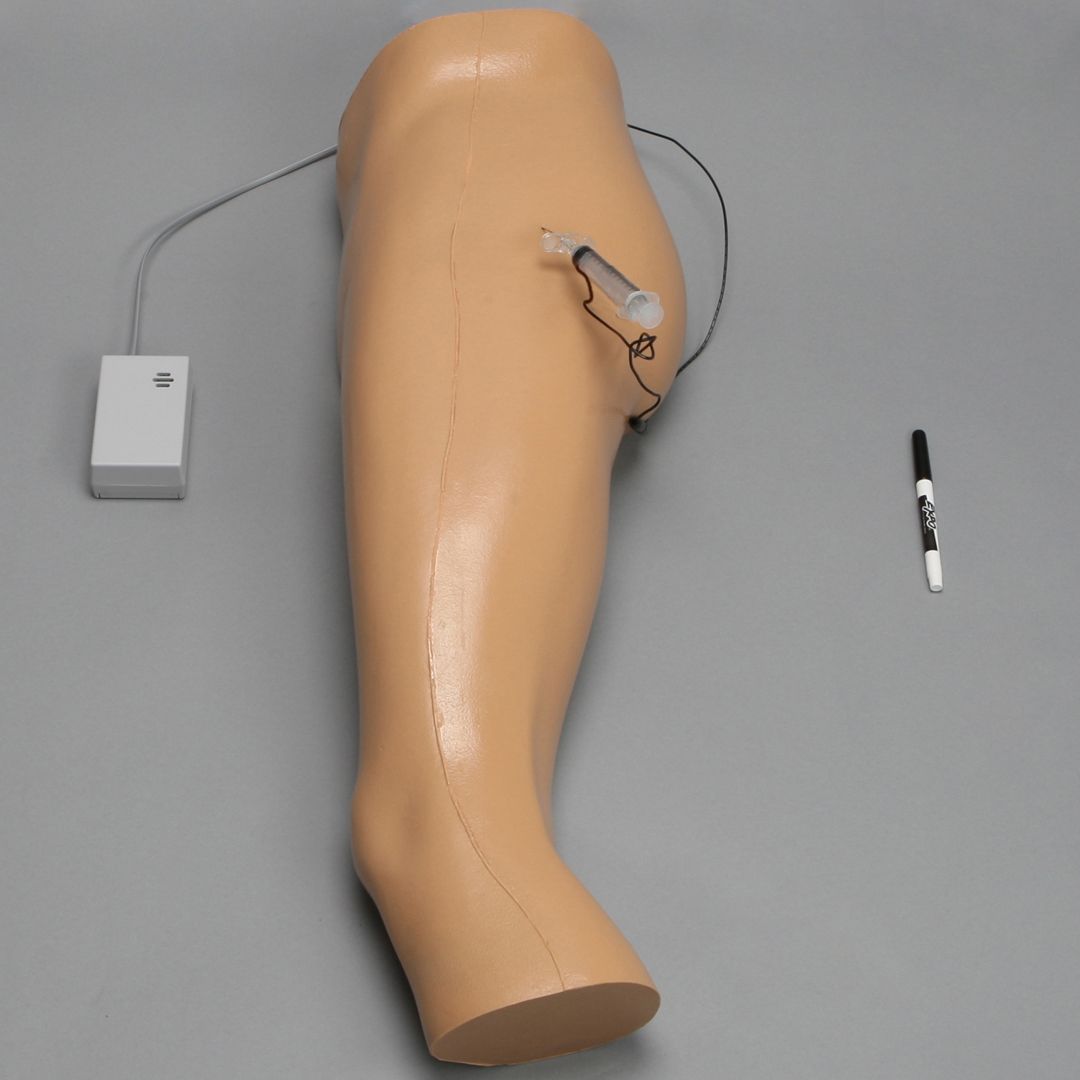 Тренажер для отработки навыков инъекций (бедро) дает звуковую обратную связь, когда игла касается внутренней структуры. Основные структуры включают щель бедренно-вертлужного сустава и вертельную сумку. По запросу могут быть добавлены и другие внутренние детали. Манекен включает: комплект игл, эмиттер обратной связи, маркер на водной основе и батарейку.