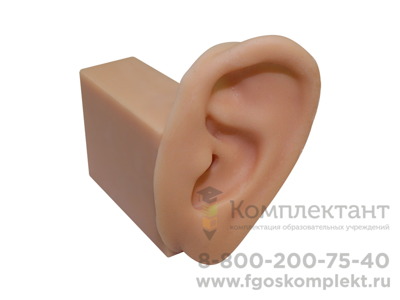 расположена на твердом основании; обладает максимально точной анатомической структурой; имеет реалистичную текстуру кожи; ушная раковина выполнена из эластичного материала; наружный слуховой проход со встроенной барабанной перепонкой.Модель обеспечивает возможность промывания наружного слухового прохода.