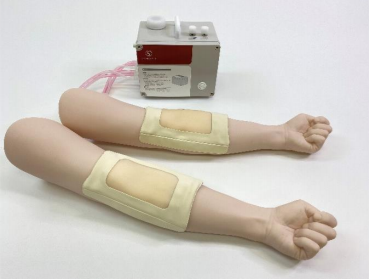 1. Функция моделирования набухания кровеносных сосудов. Вкладыш с кровеносными сосудами включает в себя новую медиальную кожную вену, которая не протекает даже после 10 000 инъекций (по результатам наших испытаний). Благодаря герметичности вкладыша затраты на его замену являются минимальными. При нажатии на кнопку «Наполнение» (overswell) на насосе кровеносные сосуды наполняются, как показано на фотографии. Выполнение инъекций и забора крови из набухших кровеносных сосудов возможно.