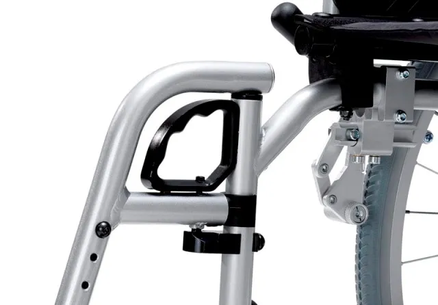 Облегченная инвалидная коляска для индивидуальных потребностей. Оптимальный комфорт за счет настройки высоты сиденья, индивидуальной установки подлокотников и угла положения опор для стоп, регулировки упругости спинки с люмбальным валиком.