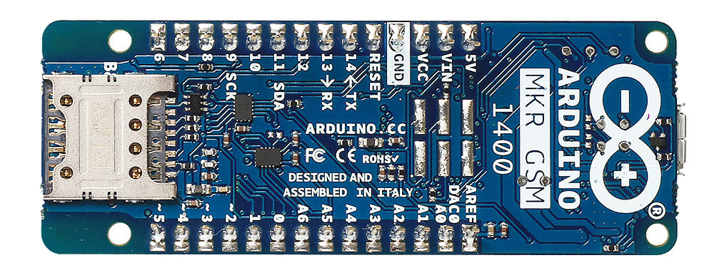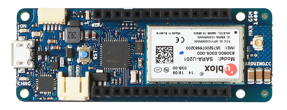 Arduino MKR GSM 1400 отличается от других контроллеров наличием модуля мобильной связи 3G. Плата подходит для управления мобильными роботами, мониторинга транспорта и передачи данных из любой точки мира - возможности ограничены только покрытием сотовой сети. Плата Arduino MKR GSM 1400 может активировать исполняющие модули по входящему звонку, опрашивать и передавать данные с датчиков по SMS, а также выходить в интернет через GPRS/HSPA. Кроме того, она совместима с платформами интернета вещей Amazon Web Service (AWS IoT), Google IoT и аналогами. С их помощью можно управлять бесчисленным количеством датчиков и модулей, объединённых в облачную систему с удалённым доступом и защищённым соединением HTTPS. Мозгом платформы Arduino MKR GSM 1400 является 32-битный микроконтроллер Microchip ATSAMD21G18 с вычислительным ядром Cortex-M0+ тактовой частотой 48 МГц, 32 КБ RAM и блоком Flash-памяти на 256 КБ. Модуль U-blox SARA-U201 обеспечивает мобильную связь 3G/2G с поддержкой UMTS/HSPA и GSM/GPRS. Стандарт 3G обеспечивает входящую скорость передачи данных до 7,2 Мбит/с и исходящую до 5,76 Мбит/с. Для сотовой связи вам понадобится карта формата micro-SIM. В зоне слабого приёма воспользуйтесь дополнительной антенной усиления GSM-сигнала. Криптографический модуль ECC508 защищает передаваемые данные алгоритмами шифрования P-256 / SHA-256 и разгружает процессор от соответствующих операций. Внимание! Рабочее напряжение Arduino MKR GSM 1400 составляет 3,3 В, а значит, более высокое напряжение на пинах повредит электронную начинку платформы. Будьте внимательны при подключении пятивольтовой периферии. С двух сторон платы распаяны колодки по 14 выводов, из них 22 пина ввода-вывода общего назначения: На плате доступны аппаратные интерфейсы UART, SPI и I²C. Внешняя антенна для сотовой связи GSM подключается к плате через разъём Micro U.FL. Для программирования платформы используется среда Arduino IDE, визуальная среда программирования XOD IDE или произвольный инструментарий C/C++. Для прошивки понадобится кабель Micro-USB. Для работы с сотовой связью используйте библиотеку MKR GSM, в которой реализованы базовые функции мобильного телефона. Также существует готовый набор библиотек для работы с интернетом вещей и облачными сервисами наподобие Google IoT и AWS IoT. Для питания платформы можно использовать порт Micro-USB, контакт Vin и разъём для аккумуляторной батареи. Источник определяется автоматически. Все цепи питания проходят через линейный регулятор напряжения и приводятся к 3,3 В. Обратите внимание, что SIM-карта и GSM-антенна не входят в комплект устройства. Начинка