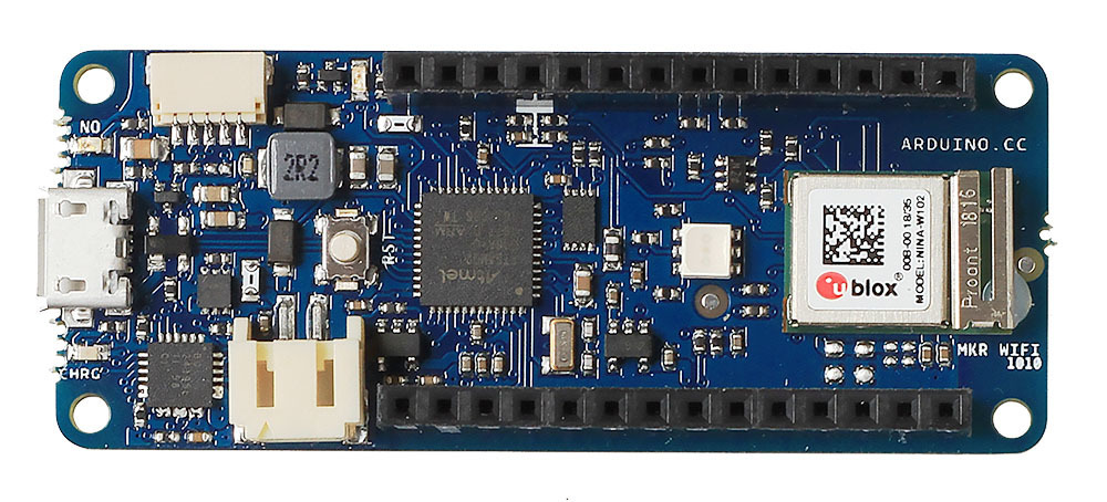 Arduino MKR Wi-Fi 1010 - платформа из семейства MKR для разработчиков, желающих проектировать проекты IoT с минимальным опытом работы в сети. Плата комбинирует микроконтроллер ATSAMD21G18 и беспроводной модуль NINA-W10. Первый отвечает за подключённую периферию и модули, а второй за беспроводные технологии Wi-Fi и Bluetooth. Полученный симбиоз позволит распределять рабочую нагрузку между элементами двухпроцессорной системы. Платформа производится американо-итальянской компанией Arduino LLC. Плата состоит из трёх основных блоков: Внимание! Платформа выполнена на архитектуре ARM Cortex M0+, значит родное напряжение пинов Arduino MKR Wi-Fi - 3,3 В. Выходы для логической единицы выдают 3,3 вольта и рассчитаны принимать не более того. Большее напряжение повредит микроконтроллер. Будьте внимательны при подключении периферии. С двух сторон платы распаяны колодки 2×14 выводов, из них 22 пина ввода-вывода общего назначения: Используйте внутренний ЦАП для аналогового аудиовыхода. Или отдайте обработку звука внешнему преобразователю через интерфейс I2S. Управляйте вашим устройством через интернет или запускайте небольшой веб-сервер c помощью библиотеки WiFiNINA. В отличие от предшественников, Arduino MKR Wi-Fi 1010 поддерживает шифрование SSL - теперь вам доступны HTTPS-соединения. На плате доступны аппаратные интерфейсы SPI, TWI/I²C, UART/Serial и I²S. Для программирования используется среда Arduino IDE, визуальная среда программирования XOD IDE или произвольный инструментарий C/C++. Для прошивки понадобится кабель Micro-USB. Для питания платформы используйте порт Micro-USB, контакт Vin или разъём для аккумуляторной батареи. Источник определится автоматически. Все цепи питания проходят через линейный регулятор напряжения и приводятся к 3,3 В. Arduino MKR Wi-Fi 1010 снабжена предохранителем, защищающим USB-порты компьютера от перенапряжения и коротких замыканий. Хотя большинство компьютеров обладают собственными средствами защиты, предохранитель даёт дополнительную уверенность. Он разрывает соединение, если на USB-порт подаётся более 500 мА, и восстанавливает его после нормализации ситуации. Что на борту