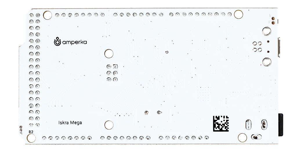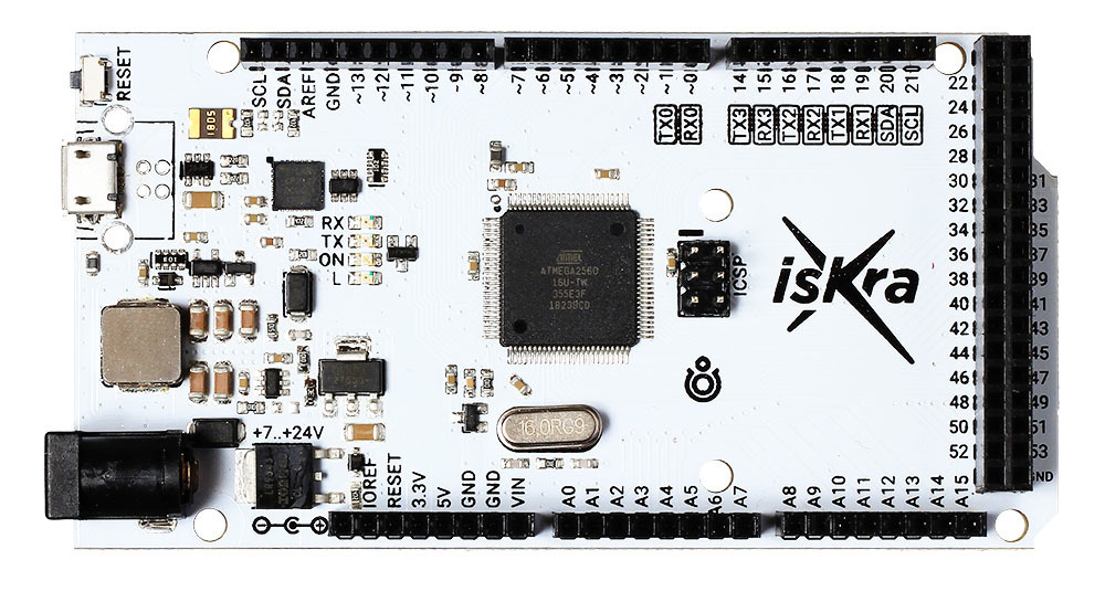 Iskra Mega делится на две части. Первая половина по конфигурации контактов идентична формфактору Arduino Rev3 и предоставляет 20 пинов общего назначения. На второй половине расположены 50 дополнительных пинов для расширения возможностей вашего проекта. Платформа совместима со всеми Arduino Shield’ами. Плата Iskra Mega построена на 8-битном микроконтроллере семейства AVR - ATmega2560. Контроллер работает на тактовой частоте 16 МГц и предоставляет в распоряжение 256 КБ Flash-памяти для хранения прошивки, 8 КБ SRAM-памяти для глобальных переменных и 4 КБ EEPROM-памяти для хранения данных. В отличие от младших собратьев, Iskra Mega имеет четыре аппаратных интерфейса UART. Платформа без переходников справится с четырьмя модулями с Serial-интерфейсом: например GPRS Shield, Troyka Wi-Fi, GPS-модулем и Troyka Bluetooth. Ноги-крылья